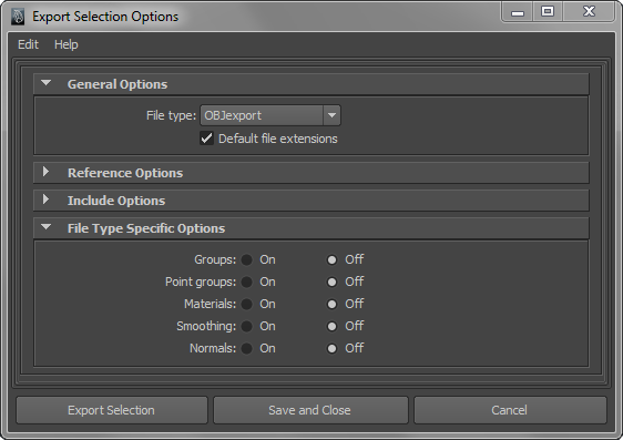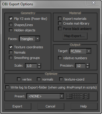 Deselect shapes, lines, hidden objects, normals, smoothing groups, material, and material libraries. Disguise does not support these.