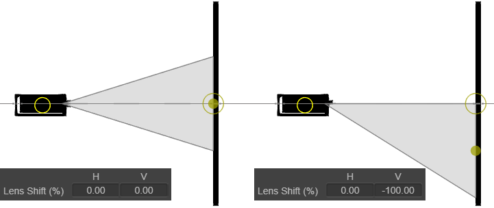 Lens Shift allows to deviate the optical axis of the Beam. Select your Projector. Go to its Properties, and to Lens Shift. H = Horizontal, V = Vertical.