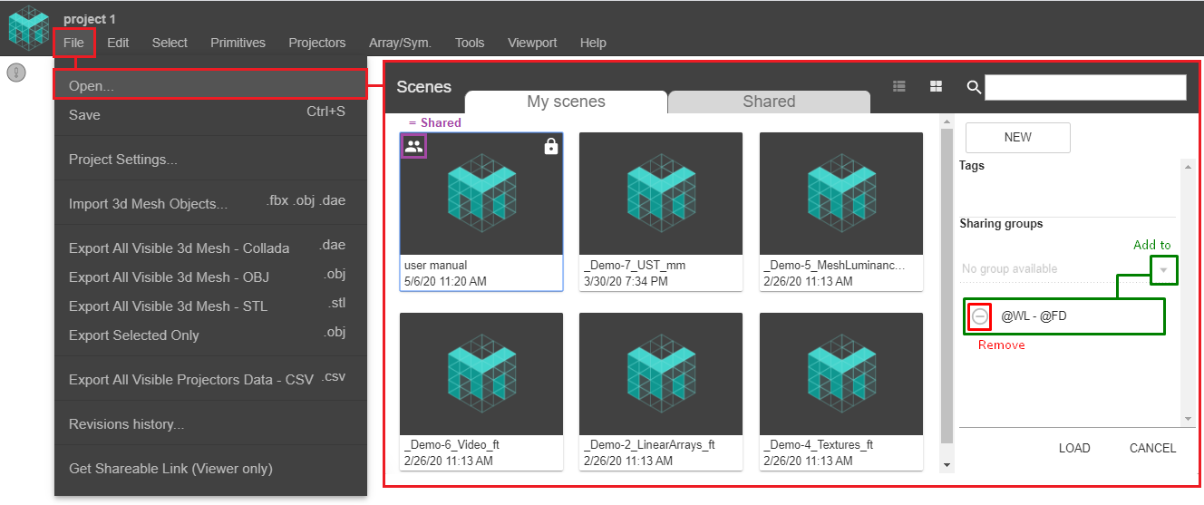 When you share a Scene file, it will also copy all of its assets (Projectors, Textures, 3D Objects, etc...).