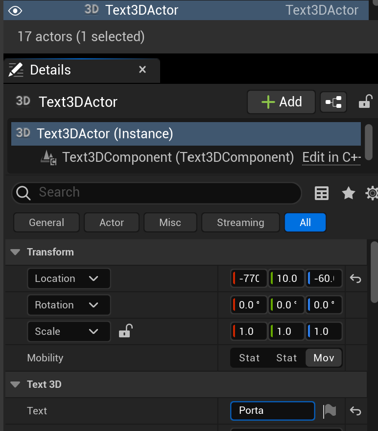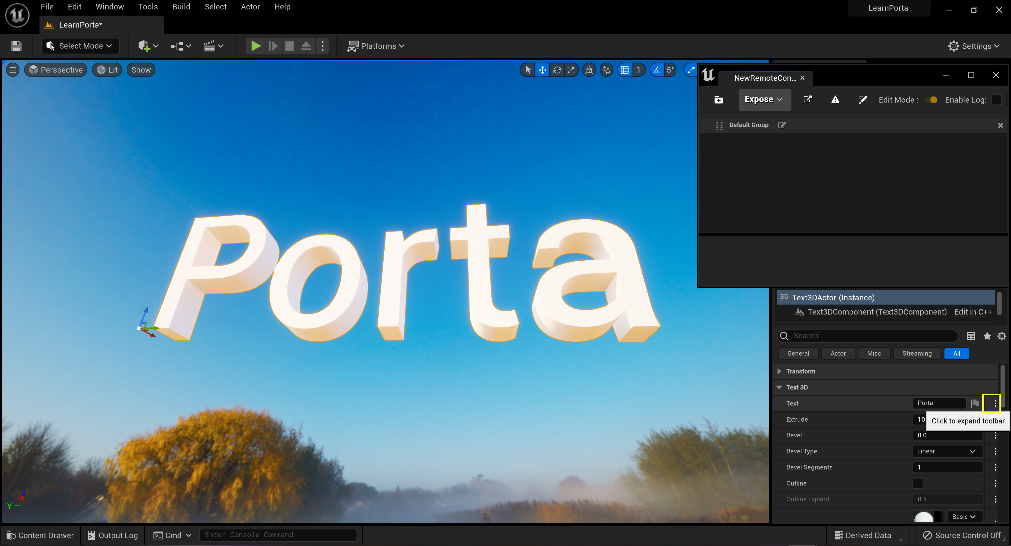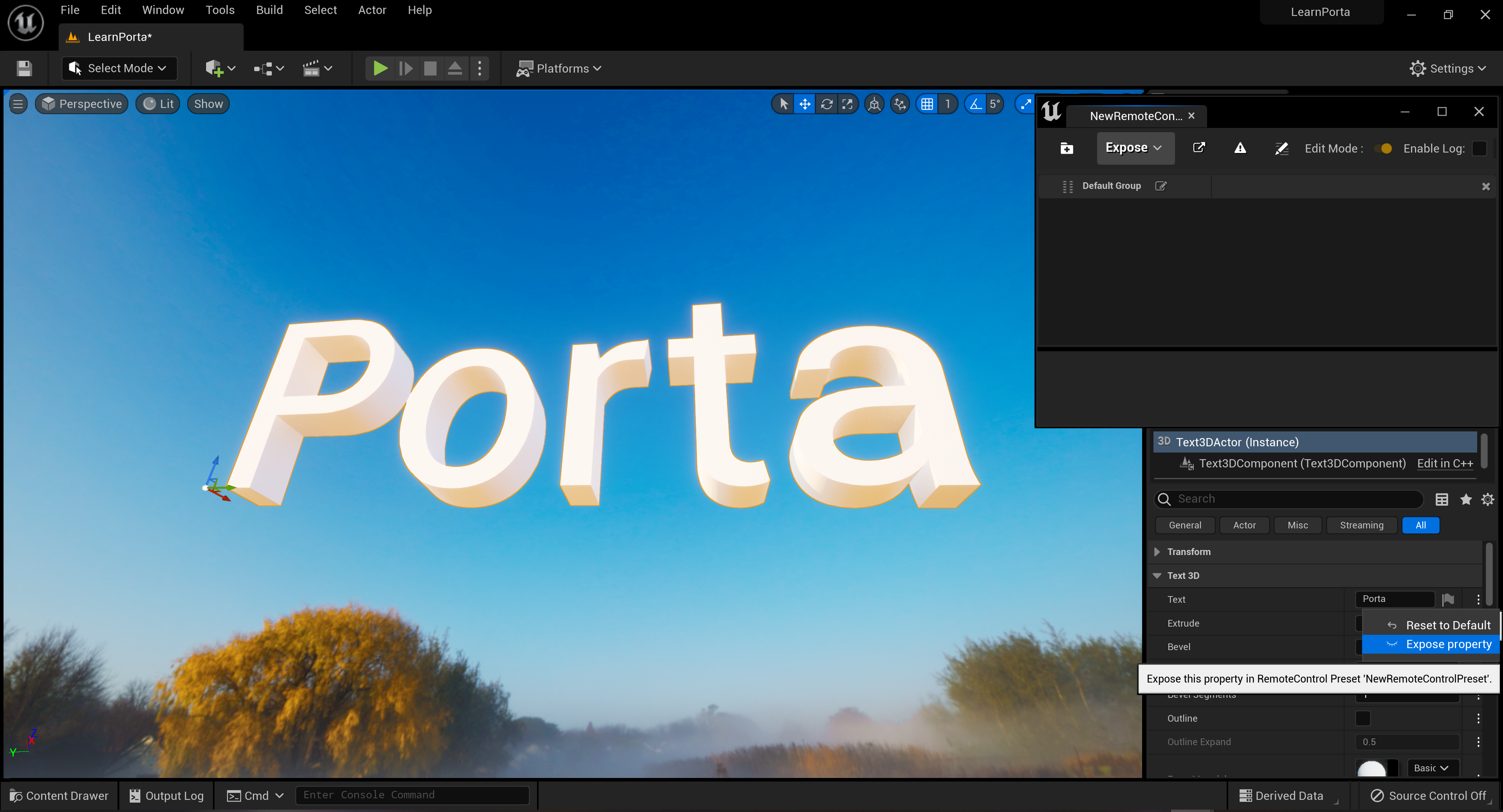 To learn this basic workflow, the project does not need to have any sample content. However, the team has provided a sample project that demonstrates how 3D Text is configured for Porta* which you can use.