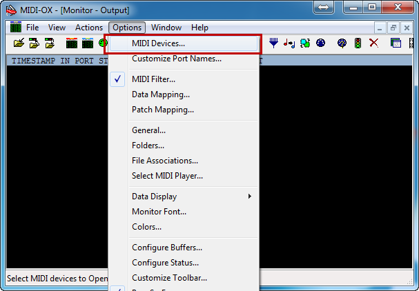 Open up MIDIOX, and select Options > MIDI Devices.