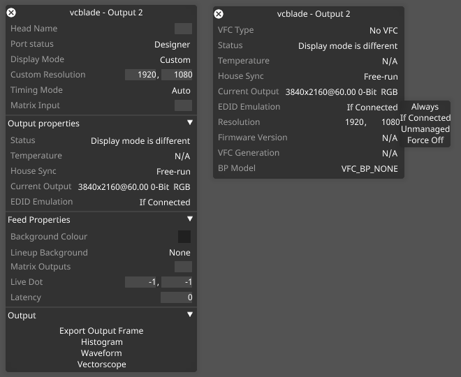 EDID emulation within Disguise software is configured via the VFC card properties editor in the Feed Output window:
