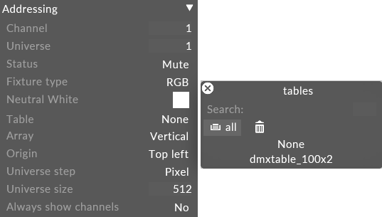 A DMX table screen is a DMXscreen whose DMX patch is defined by a csv file. The behavior of the screen is much like the DMXscreen except that the patch is automated by the csv file allowing for more fluid patch mechanisms for non-linear patching.