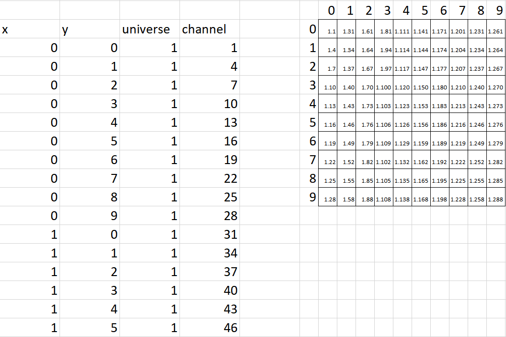 The first line is the four column headers (pos x, pos y, universe, channel) and is ignored. These properties are explained as follows.